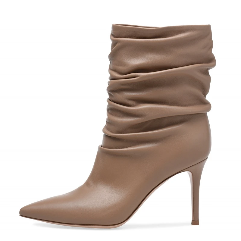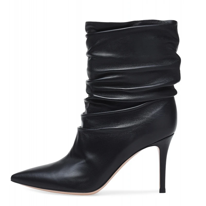 Women Mid Boots 2019 Sheepskin Leather Pointed Toe Thin Heels Boots Sexy Women Fashion Pleated Stre
