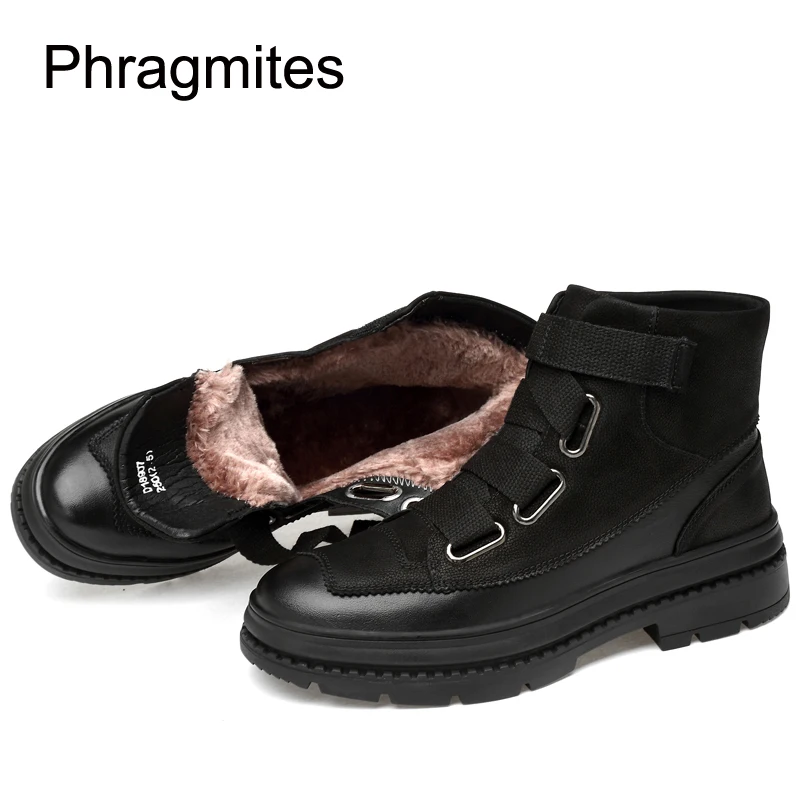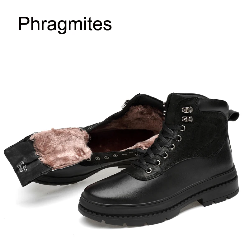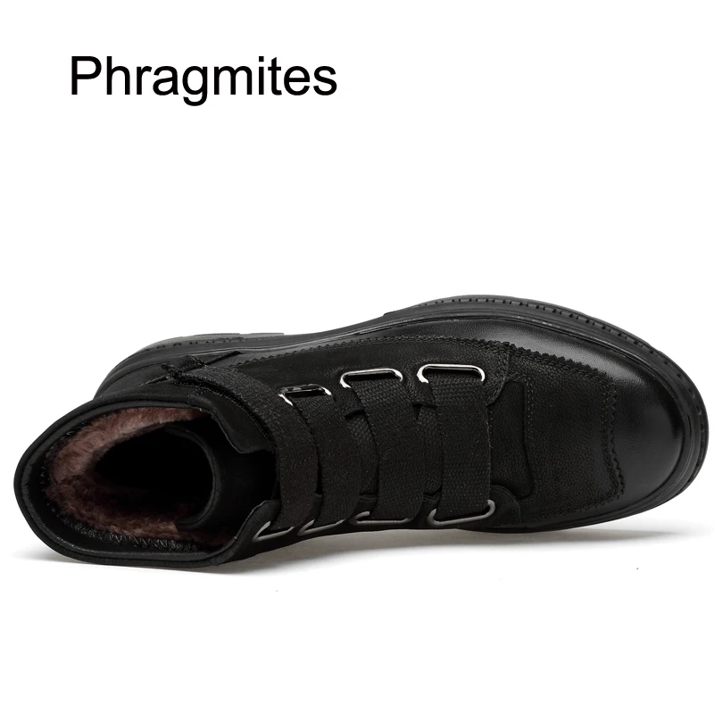 TOP Phragmites Leather Shoes Men Black Ankle Boots Winter Plush Shoes Outdoor Warm Snow Shoes All-match