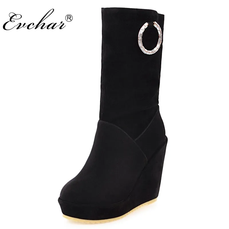 HOT Sale EVCHAR Boots Women Platform super High Heel Winter Boots Pleated Mid Calf Wedge Heel Boots Round To