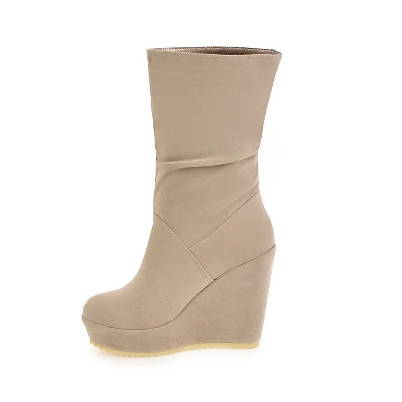 EVCHAR Boots Women Platform super High Heel Winter Boots Pleated Mid Calf Wedge Heel Boots Round To
